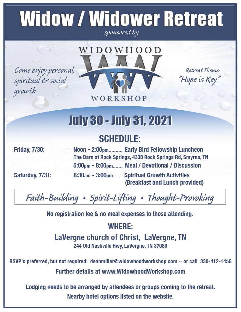 - Widow/Widower Retreat (LaVergne, TN) – Aug 3-4 (Click for Details)